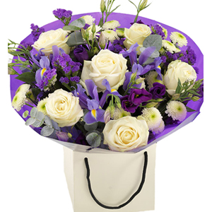 A beautiful display of pretty flowers in cool shades of purple and white, featuring delicate white Roses and Spray Chrysanthemums with purple Lisianthus, Statis and Irises.